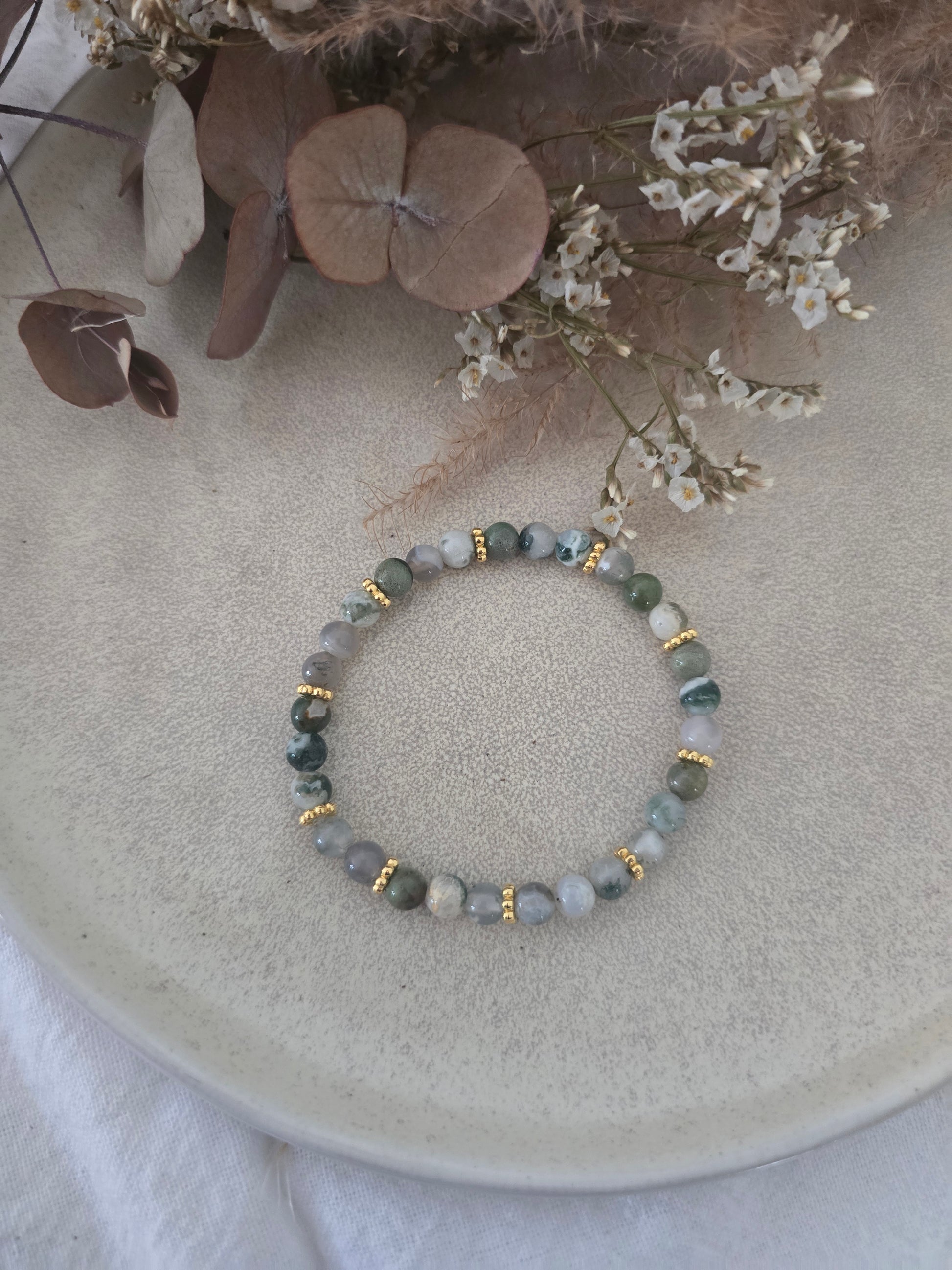 Le bracelet "Diana" en Agate Mousse, orné de breloques dorées, est bien plus qu'un simple accessoire. Il incarne une profondeur symbolique et offre des vertus.