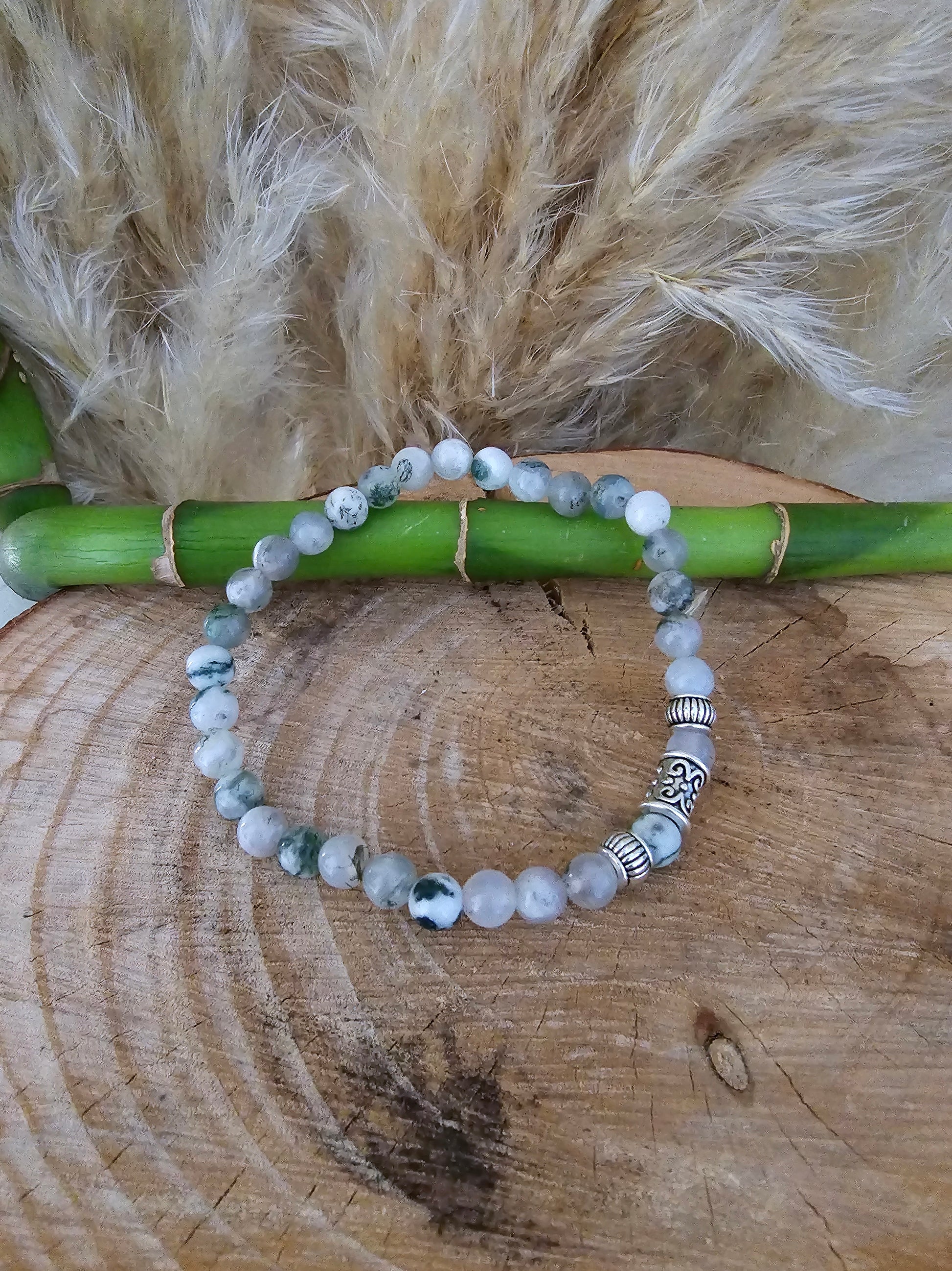 Le bracelet "Artémis" en Agate Mousse, orné de breloques argentées, est bien plus qu'un simple accessoire. Il incarne une profondeur symbolique et offre des vertus.